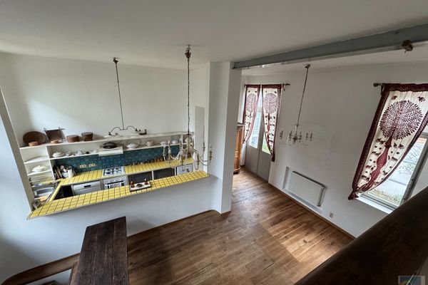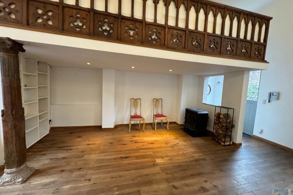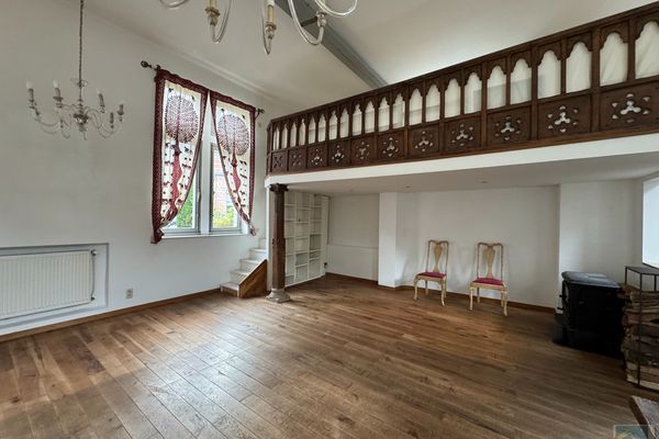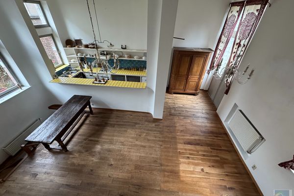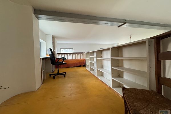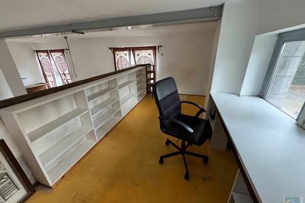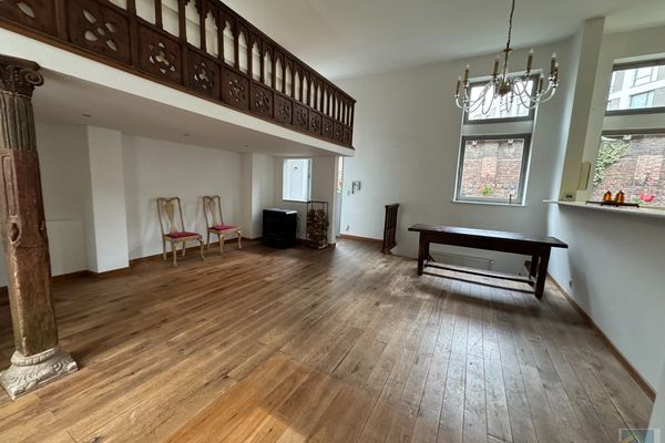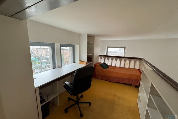cet espace est surplombé par une mezzanine de +/- 13 m2 utilisé actuellement comme bureau , ce qui permet de travailler en toute quiétude sans être coupé totalement de la vie d'en bas
