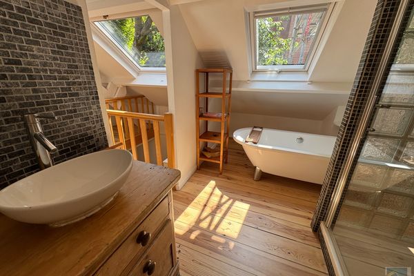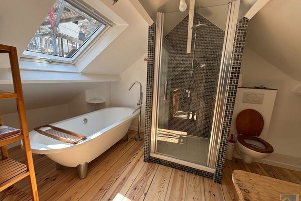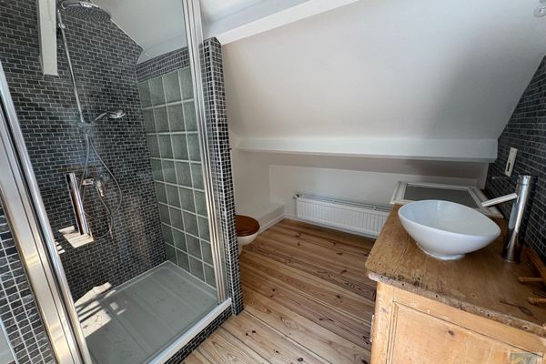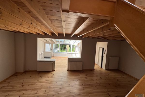 -très bel espace "family room" en mezzanine pouvant servir de bureau, ou de chambre de +/- 15 m2, ouvert, mais bénéficiant d'une salle de bain complète (bain-douche-lavabo-wc) de +/- 7m2