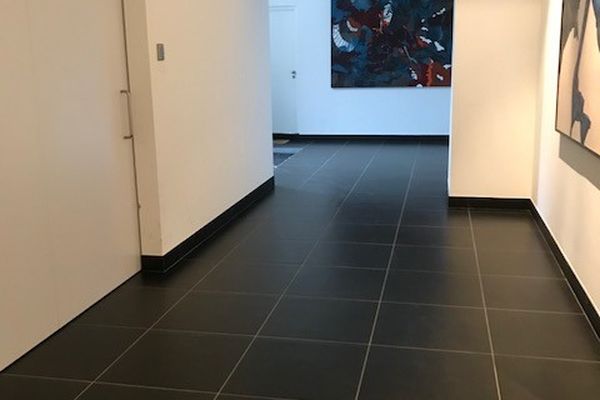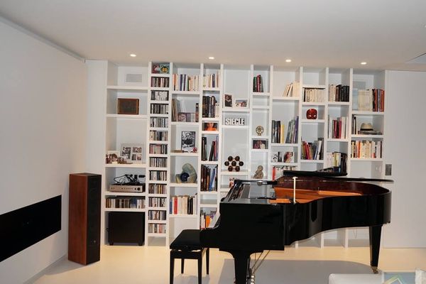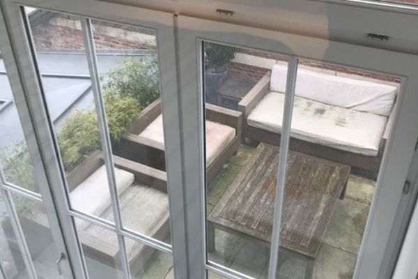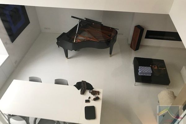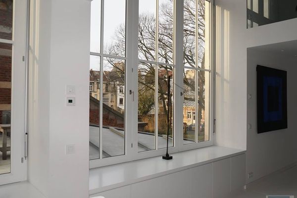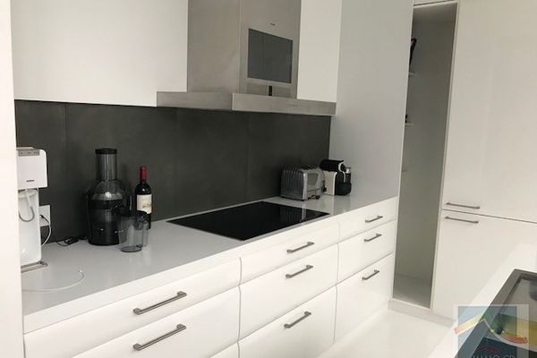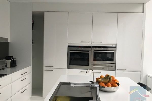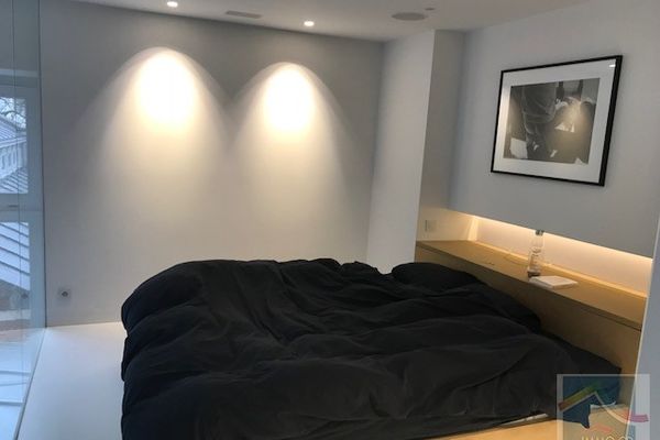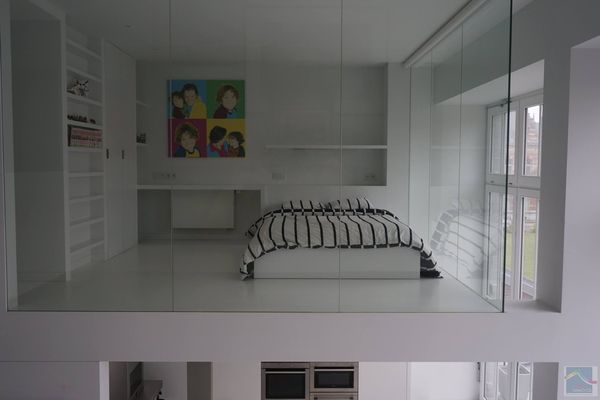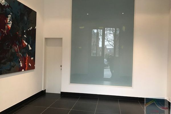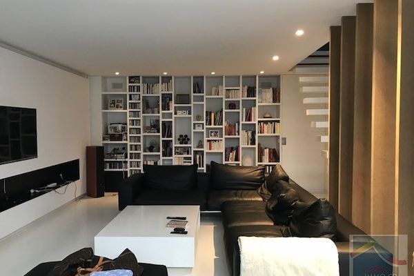 - magnifique living de +/- 60 m² qui communique avec une cuisine ouverte de +/- 10 m² hyper équipée :living très impressionnant par ses immenses baies vitrées qui laissent entrer la lumière à outrance - feu ouvert vitré et écran TV encastré dans le mur : loft High Tech - buanderie chaufferie