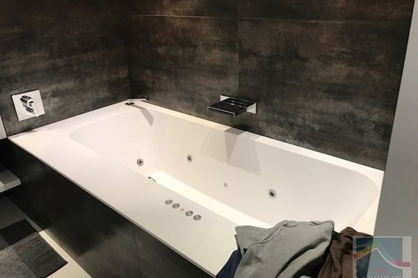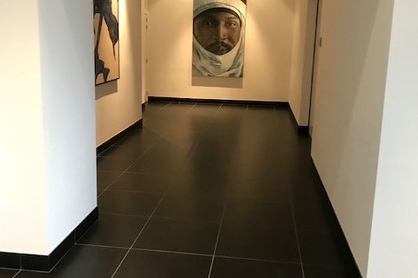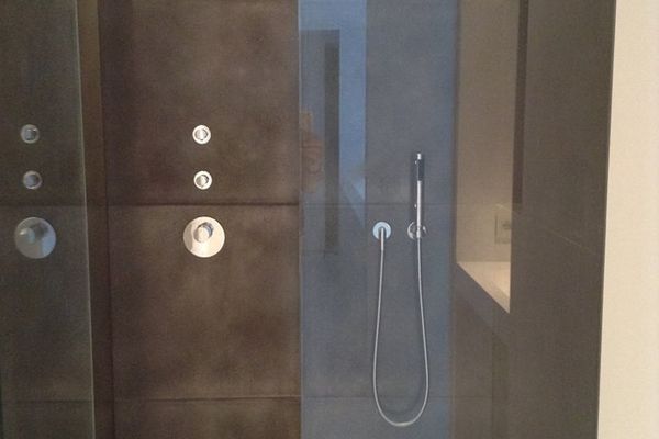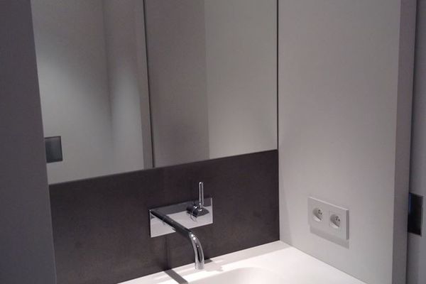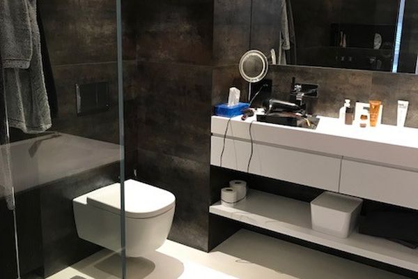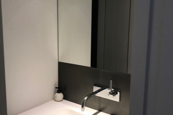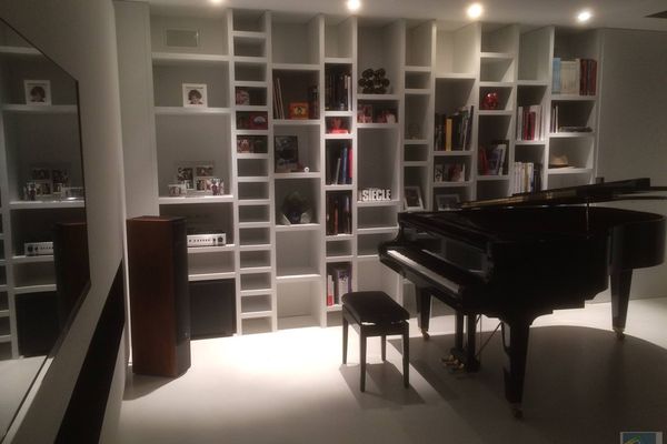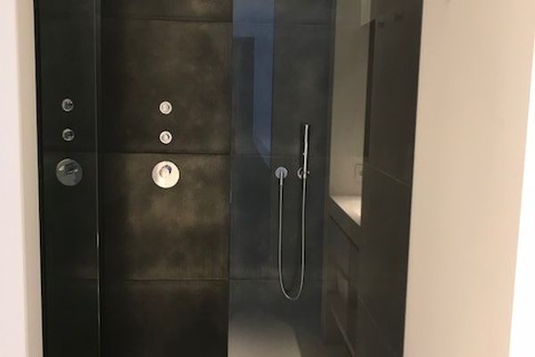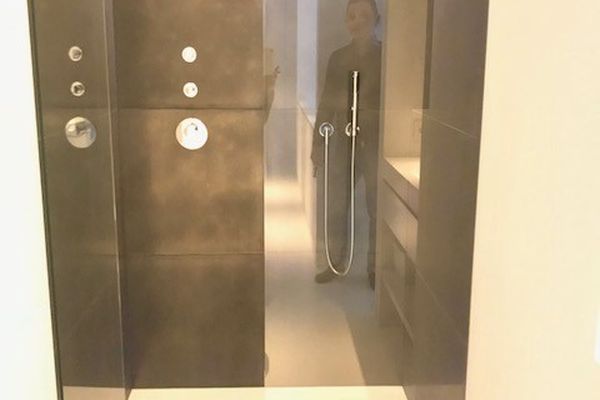 *2è niveau-en mezzanine, espace bureau et salle de cinéma de +/- 16 m² avec vue sur le living -salle de bains complète avec bain High Tech et douche italienne, aux matériaux muraux hors du commun : grandes dalles murales recouvertes d'aluminium....superbe revêtement - salle de douches : douche italienne au revêtement mural similaire à celui de la salle de bains-chambre parentale avec placards et salle de bains privative -chambre 2 avec salle de douche privative