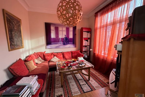 **très beau living lumineux de +/- 45 m2 (deux pièces en enfilade en façade) avec parquet au sol et bénéficiant d'un petit balcon