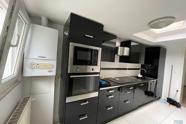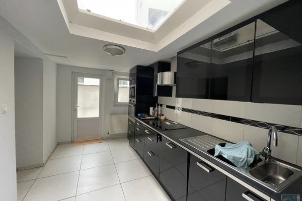 *cuisine superéquipée de +/- 12 m2 avec frigo, lave vaisselle, vitro, hotte , four et donnant accès à une petite cour